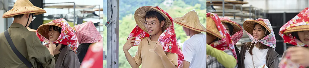 차밭에서 우리는 전통 차 따기 복장을 갖추고 Winking Studios가 후원하는 구역을 둘러보았습니다.